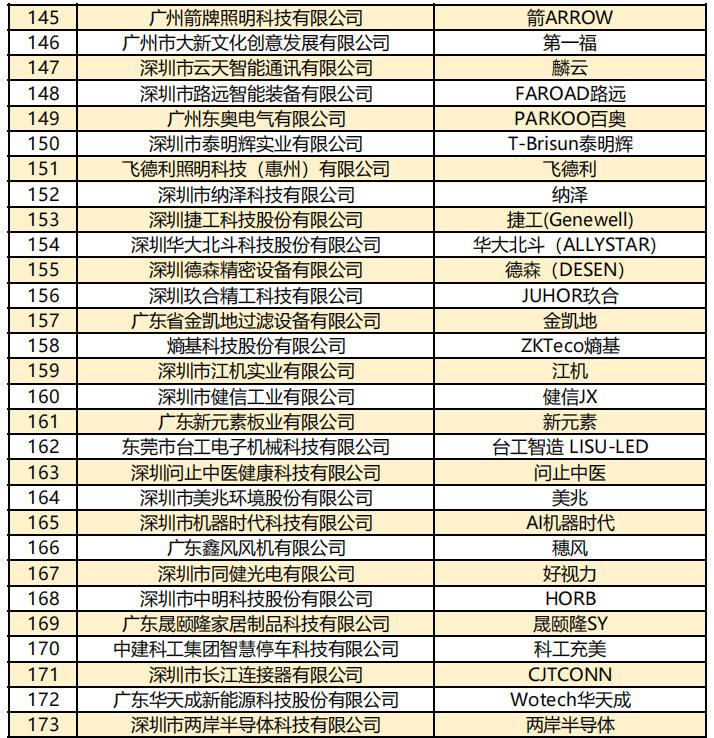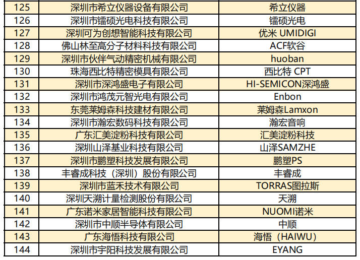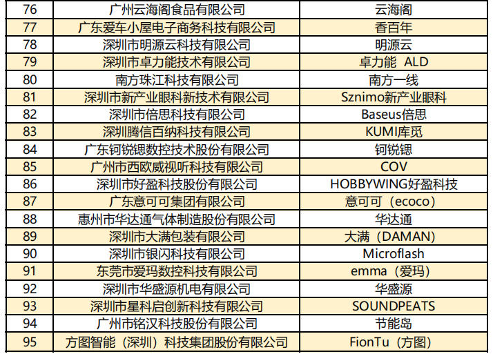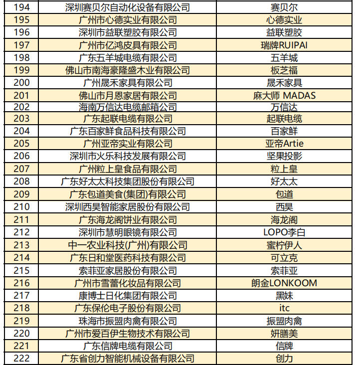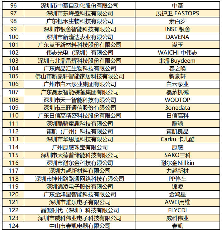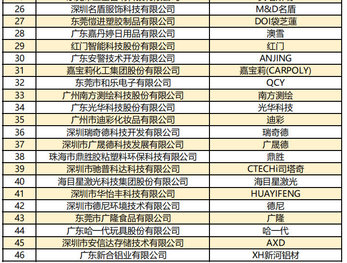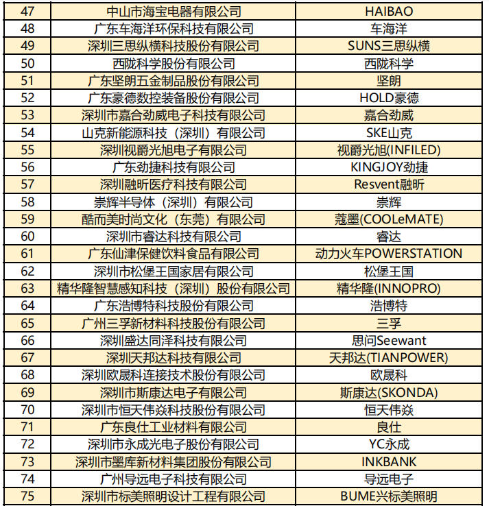 国货之光计划名单:立白、小鹏、传音Transsion、珠江钢琴、蒙娜丽莎、雷曼光电LEDMAN、东鹏、鹰金钱、双喜、伟昌铝材、鹰牌陶瓷、舒客、英红、香雪制药、KTC、三雄极光、金秀儿、爱华仕OIWAS、天赐、肌肤未来、DIOUS迪欧、伟业、明珞、联赢激光、贝塔斯瑞、M&D名盾、DOI袋芝蓮、澳雪、红门、ANJING、嘉宝莉CARPOLY、QCY、南方测绘、光华科技、迪彩、瑞奇德、广晟德、鼎胜、CTECHi司塔奇、海目星激光、HUAYIFENG、德尼、广隆、哈一代、AXD、XH新河铝材、HAIBAO、车海洋、SUNS三思纵横、西陇科学、坚朗、HOLD豪德、嘉合劲威、SKE山克、视爵光旭INFILED、KINGJOY劲捷、Resvent融昕、崇辉、蔻墨COOLeMATE、睿达、动力火车POWERSTATION、松堡王国、精华隆INNOPRO、浩博特、三孚、思问Seewant、天邦达TIANPOWER、欧晟科、斯康达SKONDA、恒天伟焱、良仕、YC永成、INKBANK、导远电子、BUME兴标美照明、云海阁、香百年、明源云、卓力能ALD、南方一线、Sznimo新产业眼科、Baseus倍思、KUMI库觅、钶锐锶、COV、HOBBYWING好盈科技、意可可ecoco、华达通、大满DAMAN、Microflash、emma爱玛、华盛源、SOUNDPEATS、节能岛、FionTu方图、中基、展护卫EASTOPS、素百岁、INSE银舍、DAVENA、崀玉、WAICHI 中伟志、北鼎Buydeem、春之唤、新豪轩、白云泵业、磊蒙机械、WODTOP、3onedata、日信高科、酷骑、素肌良品、Carku 卡儿酷、原感、SAKO三科、耐尔金Nillkin、力越新材、PP停车、锦凌、金鸿星、AWEI用维、FLYCDI、威科伟业、春凯、希立仪器、镭硕光电、优米 UMIDIGI、ACF软谷、huoban、西比特 CPT、HI-SEMICON深鸿盛、Enbon、莱姆森Lamxon、瀚宏音响、汇美淀粉科技、山泽SAMZHE、鹏塑PS、丰睿成、TORRAS图拉斯、天溯、NUOMI诺米、中顺、海悟HAIWU、EYANG、箭ARROW、第一福、麟云、FAROAD路远、PARKOO百奥、T-Brisun泰明辉、飞德利、纳泽、捷工(Genewell)、华大北斗ALLYSTAR、德森DESEN、JUHOR玖合、金凯地、ZKTeco熵基、江机、健信JX、新元素、台工智造 LISU-LED、问止中医、美兆、AI机器时代、穗风、好视力、HORB、晟颐隆SY、科工充美、CJTCONN、Wotech华天成、两岸半导体、雄毅华、XHGEAR、洁盟skymen、南联、日联科技、EPROPULSION、华笙光、WABON、凯尔城、PECRON百克龙、JB、热立方、仕兴鸿数控、快盾、湘联、中为、华桑、同益新、Gs Wear、宇航光通、赛贝尔、心德实业、益联塑胶、瑞牌RUIPAI、五羊城、豪隆盛木业、晟禾家具、麻大师 MADAS、万信达、起联电缆、百家鲜、亚帝Artie、坚果投影、粒上皇、好太太、包道、西昊、海龙阁、LOPO李白、蜜柠伊人、可立克、索菲亚、朗金LONKOOM、黑妹、itc、振盟肉禽、妍膳美、信牌、创力、红旗电工、DOPDEA多普迪、VSVE威诗薇儿、海美迪、新港集团、沁QIN、SONGDIAN松典、厚德金、D.COLOR迪彩、汇诚幕墙、灰度科技、KIDCHO趣巢、深圳市东部公共交通有限公司(东部公交e巴士)。