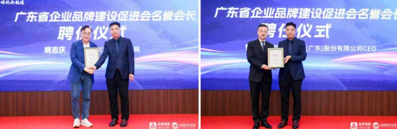 品牌强国先行工程组委会主任、广东省品促会会长王满平为慕思集团副董事长兼总裁姚吉庆与薇美姿实业(广东)股份有限公司联合创始人兼CEO曹瑞安两位知名企业家颁发广东省品促会名誉会长证书。
