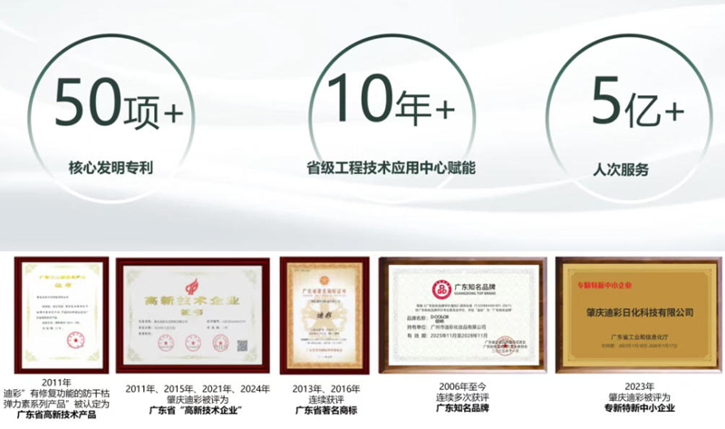 迪彩深知,东方之美从来不是孤芳自赏,而是兼容并蓄,以国际领先的现代科技为翼,让东方的养护理念有了走向世界的硬实力。许桂萍表示,迪彩是一家真正的“专精特新公司”,“专”即坚持专精特新,以匠人匠心铸专长恒心办恒业造国货精品; “精”在于产品品质上精益求精与工匠精神;“特”即特色化,迪彩聚焦发质护理细分赛道,打造具有独特功能与差异价值的国货特色产品;“新”即推陈出新,迪彩先后与华南理工、广东药学院深度合作,将高校科研成果转化为市场需求产品,采用新工艺新技术打造品牌专利护城河,累计自主申报发明专利58项,目前拥有20项有效发明专利,以技术壁垒构筑产品核心竞争力,这正是迪彩作为国货民族品牌的底气所在。