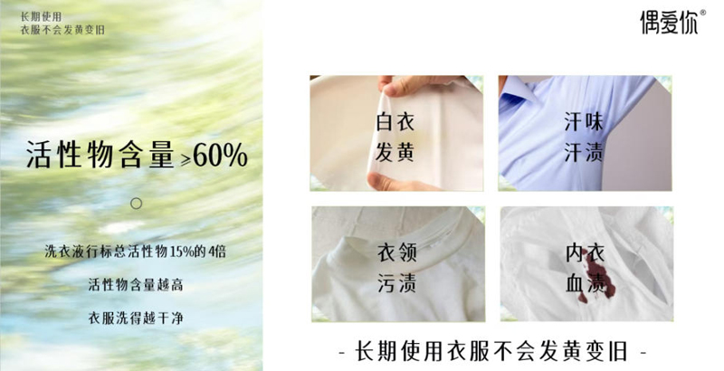 在实现“焕新”承诺上,“偶爱你”产品拥有两大核心保障:一是其活性物含量≥60%达到行业标准4倍,远超行业标准,从源头减少残留导致黄变;二是摒弃单纯依靠化学表活“暴力清洁”思路,引入仿生学“酶催化”理念精准高效7重生物酵素复配技术,可有效解决人体汗渍及食物油渍等不同场景下的各类污渍同时还能温和修复受损纤维表面还原织物本色,这种“高活性物打底,生物酵素精准攻坚”组合,真正做到衣物“洗净不留痕,护色如初新”。