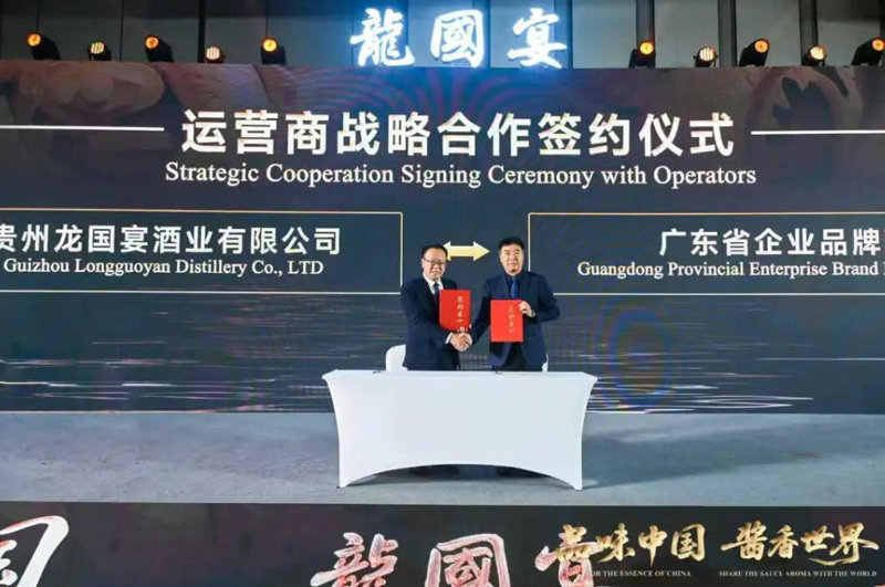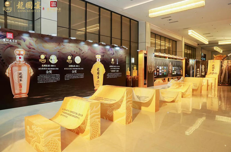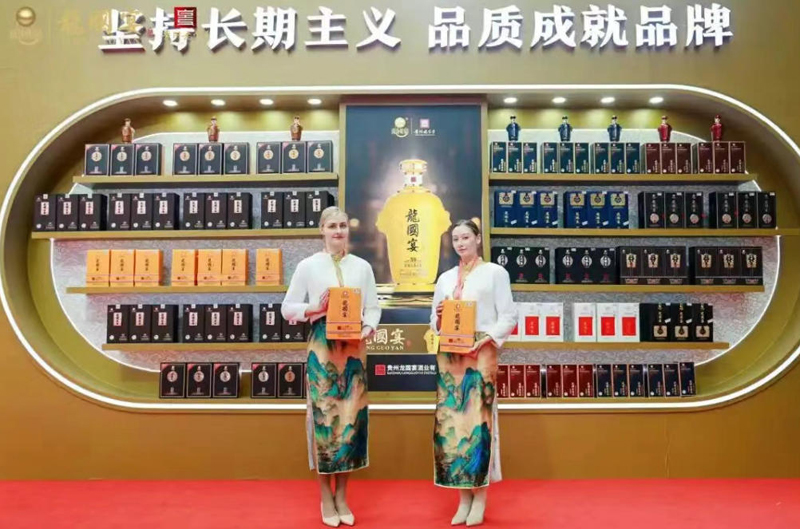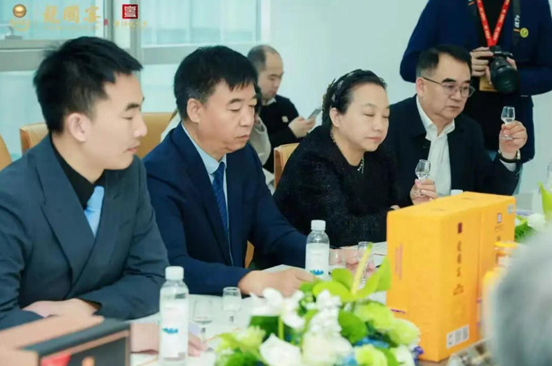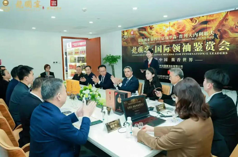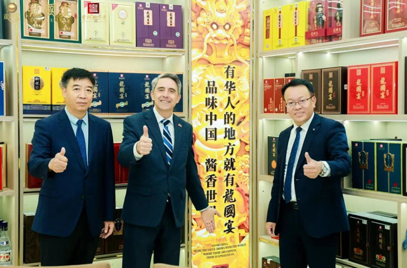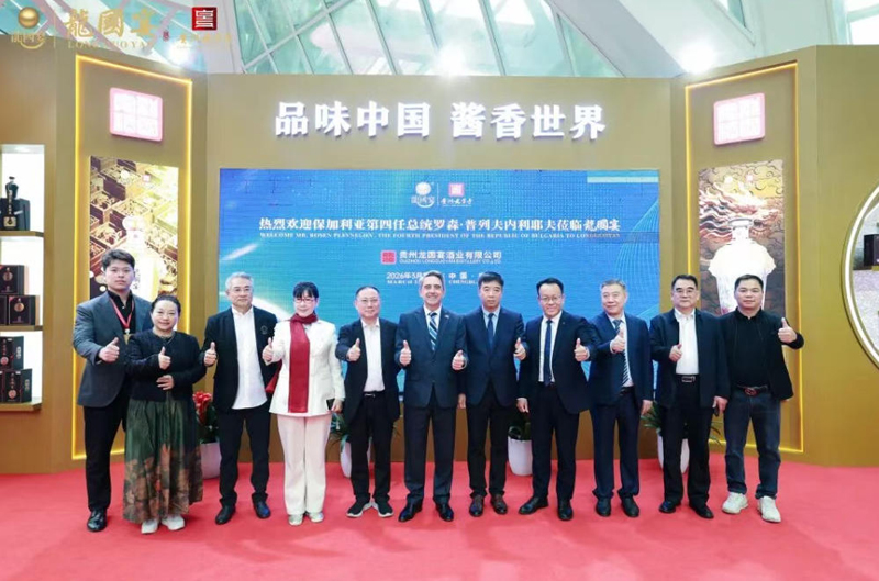 在龙国宴酒业总裁马忠福的热情邀约下,王满平会长、广东品牌企业家与罗森·普列夫内利耶夫先生首先参观龙国宴公司总部及白酒文化长廊,对龙国宴品牌发展历程做了充分了解。龙国宴历史可追溯至1958年,坐落于茅台镇7.5平方公里酱酒核心产区,其前身为“国营仁怀县茅台镇台酒厂”,是“贵州老字号”品牌,于2016年正式更名为“贵州龙国宴酒业有限公司”,2019年确立“中国高端文化酱酒”战略定位,加强其品牌国际化步伐,提出“有华人的地方,就有龍國宴”的口号。