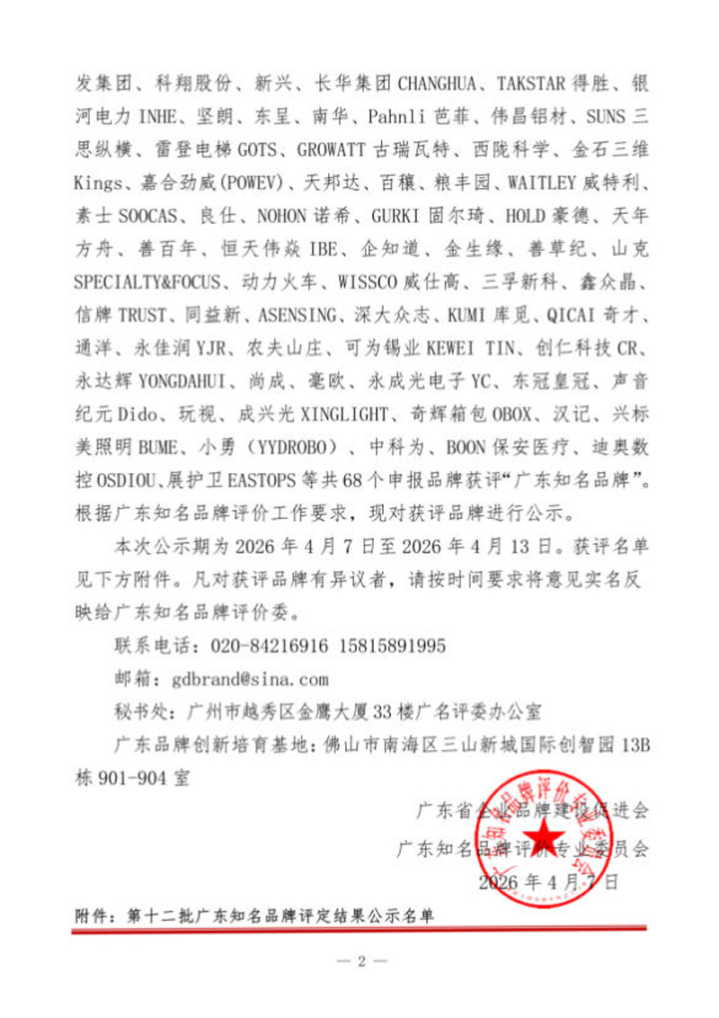 本次公示期为2026年4月7日至2026年4月13日。获评名单见下方附件。凡对获评品牌有异议者,请按时间要求将意见实名反映给广东知名品牌评价委。