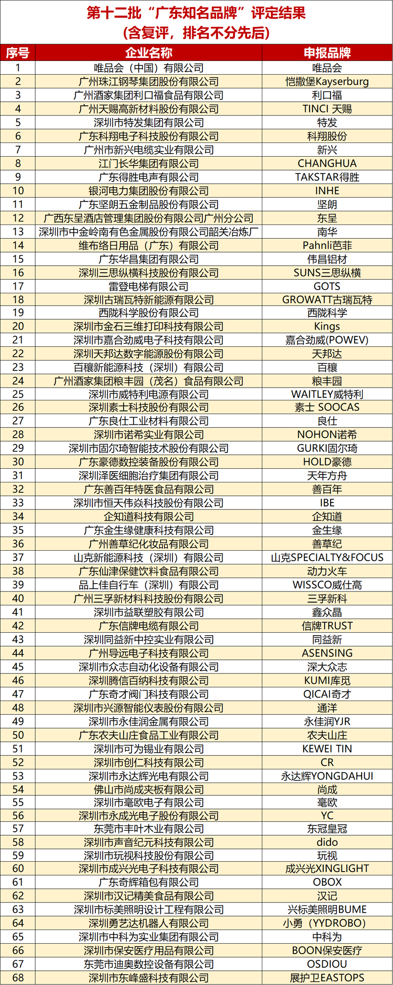 广东知名品牌团体标准评价工作自2021年4月启动。2025年11月至2026年3月,经广东省企业品牌建设促进会广东知名品牌评价专业委员会(以下简称广东知名品牌评价委)召开现场和小组评审工作会议,对申请品牌进行多轮评价,在完成企业申报、资格审查、申报材料核查、实地抽查、行业知名度调研、公开查询、专家评审等综合评价环节后,根据广东知名品牌评价通则团体标准规定,广东知名品牌评价委最终确定第十二批广东知名品牌(含复评品牌)评定名单,唯品会、恺撒堡Kayserburg、利口福、TINCI天赐、特发集团、科翔股份、新兴、长华集团CHANGHUA、TAKSTAR得胜、银河电力INHE、坚朗、东呈、南华、Pahnli芭菲、伟昌铝材、SUNS三思纵横、雷登电梯GOTS、GROWATT古瑞瓦特、西陇科学、金石三维Kings、嘉合劲威(POWEV)、天邦达、百穰、粮丰园、WAITLEY威特利、素士SOOCAS、良仕、NOHON诺希、GURKI固尔琦、HOLD豪德、天年方舟、善百年、恒天伟焱IBE、企知道、金生缘、善草纪、山克SPECIALTY&FOCUS、动力火车、WISSCO威仕高、三孚新科、鑫众晶、信牌TRUST、同益新、ASENSING、深大众志、KUMI库觅、QICAI奇才、通洋、永佳润YJR、农夫山庄、可为锡业KEWEI TIN、创仁科技CR、永达辉YONGDAHUI、尚成、毫欧、永成光电子YC、东冠皇冠、声音纪元Dido、玩视、成兴光XINGLIGHT、奇辉箱包OBOX、汉记、兴标美照明BUME、小勇(YYDROBO)、中科为、BOON保安医疗、迪奥数控OSDIOU、展护卫EASTOPS等共68个申报品牌获评“广东知名品牌”。根据广东知名品牌评价工作要求,现对获评品牌进行公示。