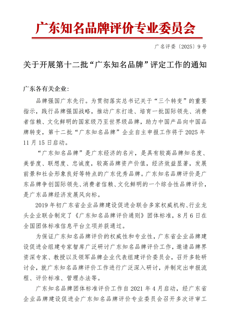 品牌强国,广东先行。为贯彻落实总书记关于“三个转变”的重要指示,践行品牌强国战略,推动广东打造、培育一批国际领先、消费者信赖、文化鲜明的国家级乃至世界级品牌,助力中国产品向中国品牌转变,近日,广东知名品牌评价专业委员会发布《关于开展第十二批“广东知名品牌”评定工作的通知》。根据“广名评委”工作安排,第十一批“广东知名品牌”企业自主申报工作将于2025年11月15日开启。符合相关条件的广东企业可通过广东知名品牌官方渠道积极参与,自主免费申报!