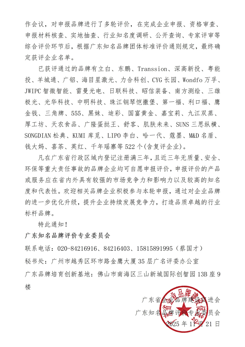 2022年9月,根据广东知名品牌评价通则要求,广东知名品牌评价委最终确定联赢激光、贝塔斯瑞、创高门窗、CHOTEST、盟大、永成隆、高而美热泵、M&D名盾、DOI袋芝蓮、深华创股份、澳雪、COV、车海洋、ANJING、HAIBAO、亚帝Artie、锦华、秀儿、欧哲OEZER、可立克牙膏、海科等22个申报品牌获评,并在2023广东品牌全球竞争力峰会上颁牌。