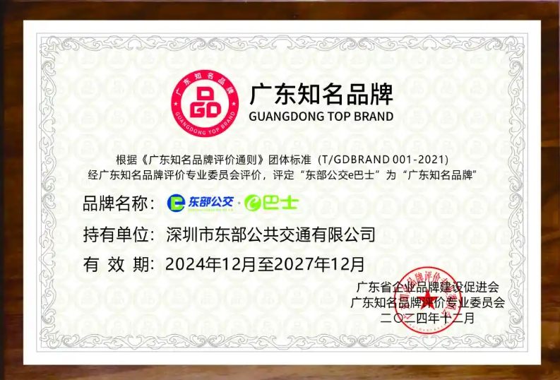 广东知名品牌是广东经济的名片,是广东品牌争创国际领先、消费者信赖、文化鲜明的一个综合性品牌评价。在各界嘉宾的共同见证下,深圳市东部公共交通有限公司旗下品牌”东部公交e巴士”,凭借卓越的品牌实力和市场表现获评“广东知名品牌”。