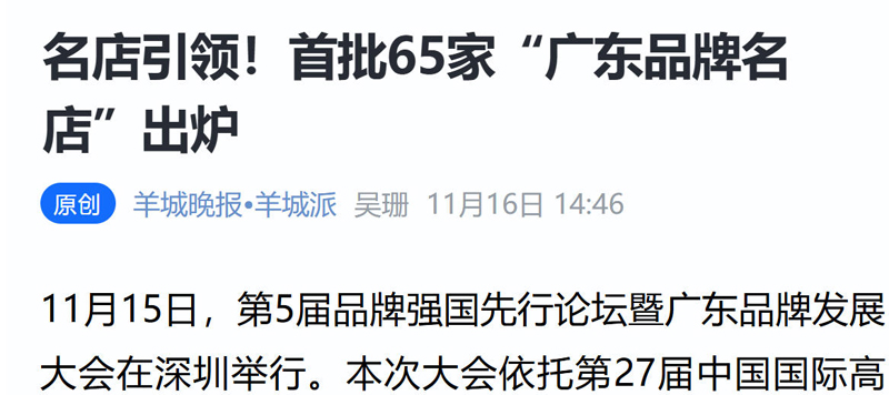 11月15日,第5届品牌强国先行论坛暨广东品牌发展大会在深圳举行。本次大会依托第27届中国国际高新技术成果交易会(以下简称“高交会”)举行。大会揭晓了首批 “广东品牌名店”、第十一批 “广东知名品牌” 名单,助力中国品牌从“制造”迈向“创造”,从“规模”走向“价值”。