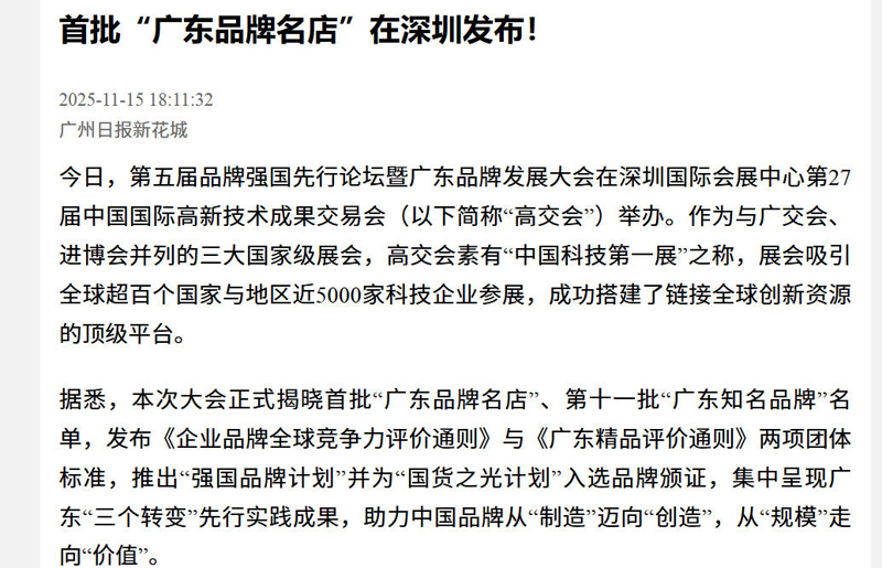 据悉,本次大会正式揭晓首批“广东品牌名店”、第十一批“广东知名品牌”名单,发布《企业品牌全球竞争力评价通则》与《广东精品评价通则》两项团体标准,推出“强国品牌计划”并为“国货之光计划”入选品牌颁证,集中呈现广东“三个转变”先行实践成果,助力中国品牌从“制造”迈向“创造”,从“规模”走向“价值”。