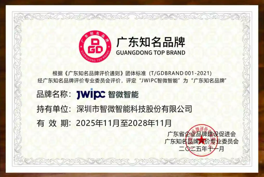 广东知名品牌是广东经济的名片,是广东品牌争创国际领先、消费者信赖、文化鲜明的一个综合性品牌评价。在各界嘉宾的共同见证下,深圳市智微智能科技股份有限公司旗下品牌“JWiPC智微智能”凭借技术创新、产品卓越品质及市场领导力获评“广东知名品牌”。