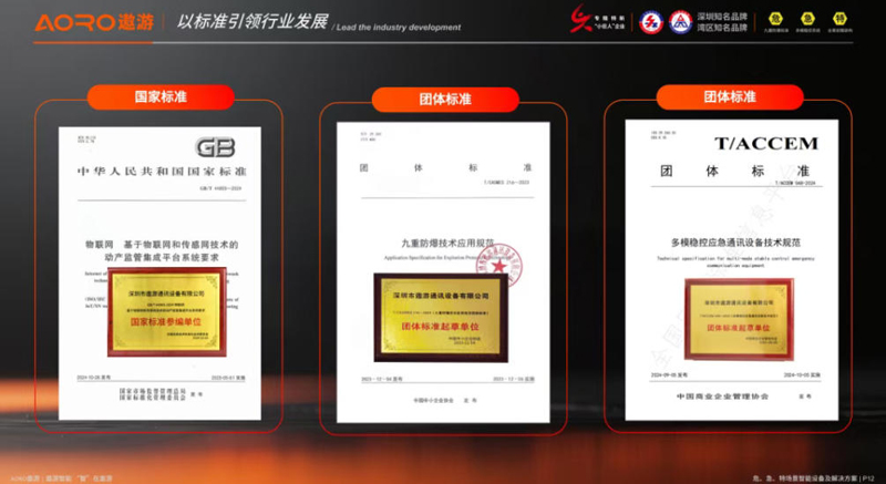 践行“让世界更安全、更高效、更智能”的使命,遨游通讯以“遨游智能,智在遨游”为愿景,以“以本立、以谦合、以勤胜”为价值观,自主研发九重防爆标准、多模稳控系统和全景前瞻架构,先后荣获128项国家标准认证、75项国家专利技术、30类行业用户验证,12项软件著作权,3项作品著作权,参与起草制定国家标准《物联网 基于物联网和传感网技术的动产监管集成平台系统要求》,团体标准《九重防爆技术应用规范团体标准》、《多模稳控应急通讯设备技术规范》以及3项企业标准等标准规范,“北斗高精度全域通讯智能终端的研究及应用”被工业和信息化部确认为科学技术成果。2023年,AORO遨游M6天通卫星电话应急终端荣获“直通乌镇”全球互联网大赛三等奖;遨游通讯荣获深圳市人工智能产业协会2023年十大创新实践基地称号。