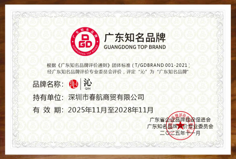 广东知名品牌是广东经济的名片,是广东品牌争创国际领先、消费者信赖、文化鲜明的一个综合性品牌评价。在各界嘉宾的共同见证下,深圳市春航商贸有限公司旗下品牌“沁”凭借卓越的文化与渠道创新力获评“广东知名品牌”。