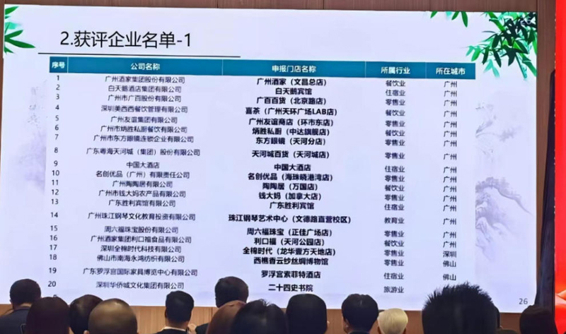 大会隆重揭晓首批“广东品牌名店”并举行颁牌仪式,首批获评门店包括首批获评门店包括广州酒家(文昌总店)、白天鹅宾馆、广百百货(北京路店)、喜茶(广州天环广场LAB店)、广州友谊商店(环市东店)、炳胜私厨(中达旗舰店)、东方眼镜(天河分店)、天河城百货(天河城店)、中国大酒店、名创优品(海珠晓港湾店)、陶陶居(万国店)钱大妈(加拿大店)、广东胜利宾馆、珠江钢琴艺术中心(文德路直营校区)、周六福珠宝(正佳广场店)、全棉时代(龙华壹方天地店)、罗浮宫索菲特酒店、二十四史书院、珠海象往酒店(拱北口岸店)、深圳湾万丽酒店、利口福(天河公园店)、猪肉婆(顺德华侨城店)、英红茶叶旗舰店、长隆熊猫酒店、泮溪酒家、莲香楼(东风店)、广隆蛋挞王(虎门万科店)、仁信老铺(顺德欢乐海岸曲水湾店)、喜万年年(华盖路步行街店)、咀香园(湖滨店)、江门赤坎古镇长盛旅店、银记肠粉店(文昌店)、海门鱼仔(天河北店)、第一福珠宝(北京路旗舰店)、天空之城 全景旋转餐厅、西樵香云纱丝绸博物馆、卡朋西餐(广州塔店)、长堤大三元酒家、顺峰山庄(大良店)、有记餐厅(梁园店)、珍之宝酒楼(伦教总店)、大良毋米粥·粥水火锅·顺德菜·粤式早茶(华侨城店)、连南县南岗老排(千年瑶寨景区)、帕沙曼(乐从联东科创园店)、陈鹏鹏潮汕菜(卓悦中心店)、卓越教育广图旗舰校区、跃·Yue现代粤菜料理、蠔家(人民大道中店)、新豪轩门窗(海三路旗舰店)、珠海怡景湾大酒店、汕头国际大酒店、湛江海滨宾馆、台山第一家兴华黄鳝饭·黄鳝婆(新会分店)、新银盏温泉度假村、官塘兄弟牛肉火锅(官塘总店)、烧蠔帮·湛江生蚝(金沙湾店)、广东瑶族文化大酒店、小榄人家、老莞家私房菜(粤晖园店)、庆华国际大酒店、江门下川岛怡和四季酒店、莞香楼(东升店)、郑汉叉烧(江燕路店)、西昊人体工学椅(皇庭广场店)、啊三麻蓉汤圆共65家不同行业门店企业借卓越产品与独特体验,成为广东服务消费升级的品质标杆。