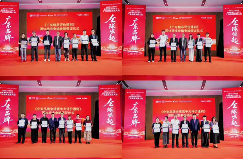 为推动加速广东品牌全球崛起,同时也为全国品牌企业打造国际知名品牌提供专业科学指引,大会正式发布由广东省企业品牌建设促进会牵头制定的《广东精品评价通则》与《企业品牌全球竞争力评价通则》两项团体标准,共有来自华南理工大学、广东工业大学、湖南省品牌建设促进会、重庆市品牌学会、湖北省品牌建设促进会、中南大学中国式现代化品牌发展研究院、中正标准和立白企业集团、珠海格力电器、天农食品集团、华帝股份、广州酒家集团、广汽乘用车有限公司、珠海双喜电器、蒙娜丽莎集团、广东格兰仕集团、广州医药集团、广州万孚健康、薇美姿实业、名盾服饰等全国多家重点大学、品牌社团和领军企业共同参与编制,大会现场举行参编单位及起草人颁证仪式。
